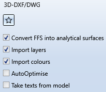 The settings specified here can be saved as favourites. To do this, click on the symbol in the dialogue window. You can find more information on favourites management in the in the Manage Favourites topic of the HiCAD Basics Help. You can specify which favourite is used as the default in the import dialogue in the Configuration Editor at Interfaces > Import.