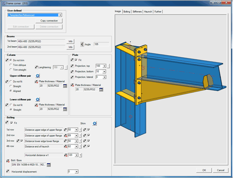 Click the Extended button to display further data of possible connections. If required, set one or several filters, such as Bolts, Strengths, etc. to restrict the selection criteria. Select the required connection and exit the window with OK.