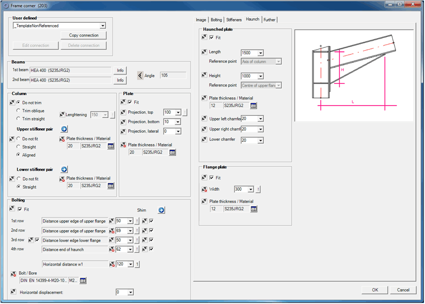 The fields of the dialogue window, e.g. the data for the plate or the bolting, are automatically filled with the values from the DAST table. When you change the values, HiCAD always checks whether the connection is still DAST-conform.