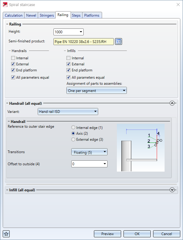 Here you determine the railings - inside and outside - for the spiral staircase as well as for the stair end platforms and safety platforms.