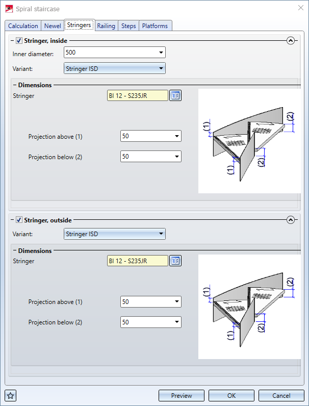 On this tab you select the stringer variant, the dimensions of the stringers and the projection (excess length) at the top and bottom in relation to the steps.