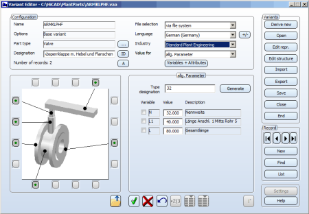 Depending on the variant type, HiCAD will display the appropriate user interface for the variant.