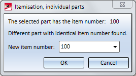 - If an attempt was made to assign an item number that has already been assigned to a part from a part group with rule-compliant number assignment, this will be indicated in the dialogue window, and the input will be rejected. Correct the number.
