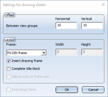 The sheet size will be defined by the size of a predefined DIN frame, e.g. DIN_A3. If you want the scale of the view groups/views to be automatically adjusted to the frame size, activate the Adjust scale to frame size checkbox. - Fit DIN frame