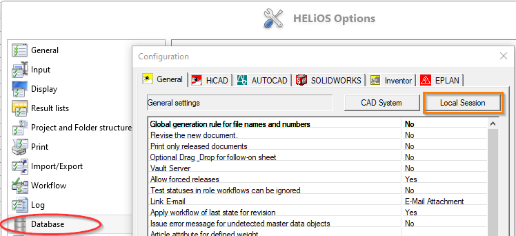 You call it by selecting HELiOS Options > Database and opening the General tab in the Configuration dialogue window. There, click on the Local Session button: