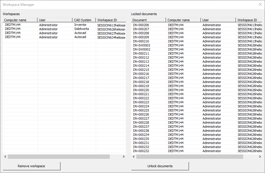 The Workspace Manager dialogue window then displays all local workspaces of the logged-in user, as well as the documents locked by these workspaces: