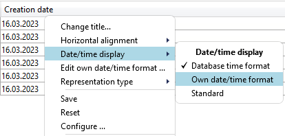 For example, in result lists you can change the format of time and date information by right-clicking on the header of columns referring to dates: After selecting Time/date display you can switch from the default setting Standard (see also HELiOS Options > General > Units and formatting) or from Datadase time format (this is the database setting mentioned above) to Own date/time format.