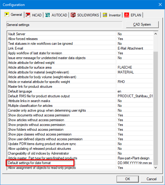 When export mapping from HELiOS, date attributes are written to STRING attributes in the appropriate format. This allows them to be output in the title block, for example. If necessary, the export mapping also changes the data type of an already existing attribute. Since no distinction is made whether the attribute was newly created or an existing attribute is overwritten, the type of the attribute is always set to a text attribute.