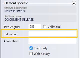 This means: Manually assigned init values for certain fields in the Mask Editor may be overridden, if a certain automated initialisation is provided in the Attribute Editor for a certain operation where a new object emerges from the original one, or if a certain initialisation is set at a certain workflow step. In turn, a workflow action list from EDBSETUP may also override initialisations through the attribute editor. Attribute mapping with an external application such as HiCAD may overwrite initialisations previously set by HELiOS. While certain data, such as dates set at creation and user credentials, are fixed, changes written to database fields by KST functions can in turn overwrite content initialised by HELiOS.
