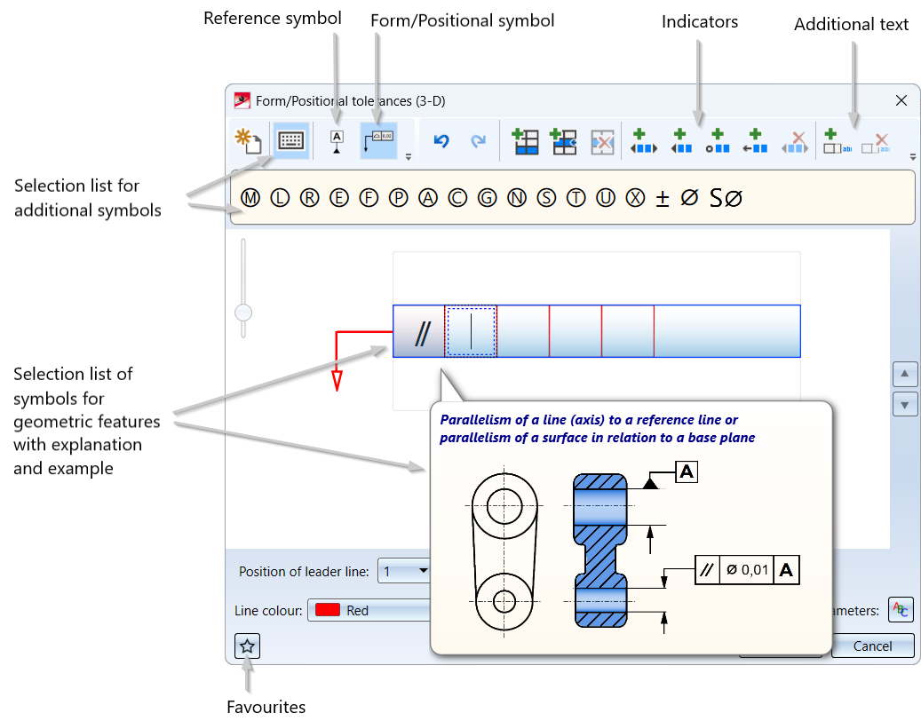 function, tolerances with reference symbol (DIN EN ISO 5459) as well as form/positional symbols (according to DIN EN ISO 1101 and 14405-1) can be conveniently created.