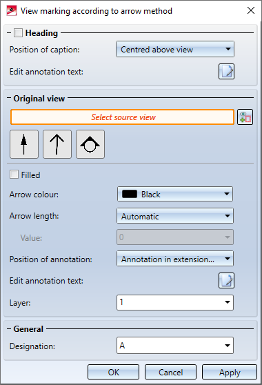 Select the symbol for the viewing direction and set the corresponding parameters. If the original view is a 3-D view, e.g. an axonometry, the selection of the symbols will have no effect. In this case, the system will always use a 3-D arrow.