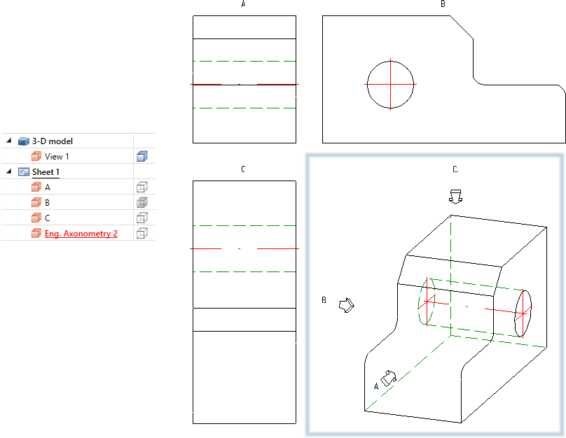 In the following illustration, the front view, the left side view and the top view have been marked according to the arrow method - with the axonometry as the original view.