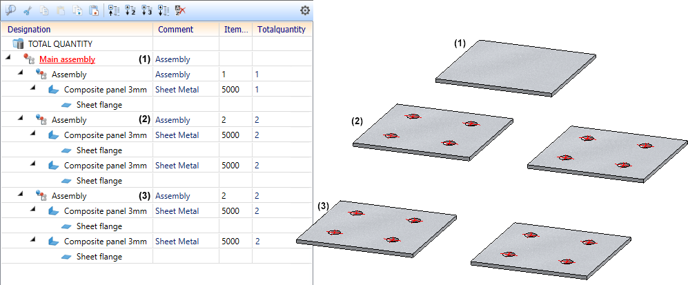 In contrast, let us consider the following drawing, consisting of two assemblies (1) and (2). A copy (3) of assembly (2) is subordinated to assembly (1). When itemising by assembly, the assemblies (2) and (3) will receive the same item number, but since the two assemblies are not on the same hierarchical level, their total quantity is 1.