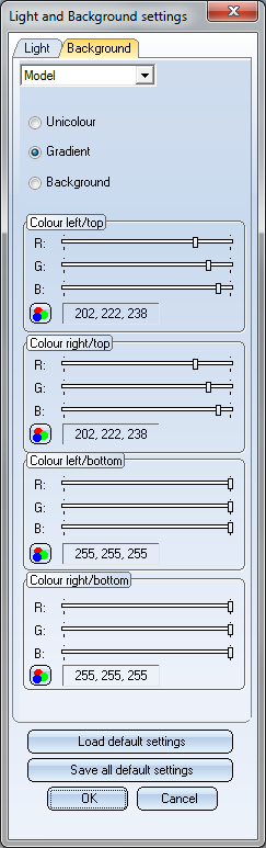 Here you define the screen background - a colour, a colour gradient or a BMP file - separately for the Sheet area and the Model area. - Light