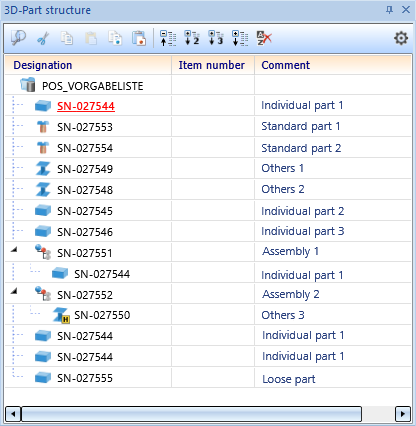 Now, the remaining parts with the article number SN001 are being checked. These are Part 1 and Part 2. The parts agree completely with all the other criteria, i.e. they are considered as the same ones. Thus, both parts are assigned to Item number 2.