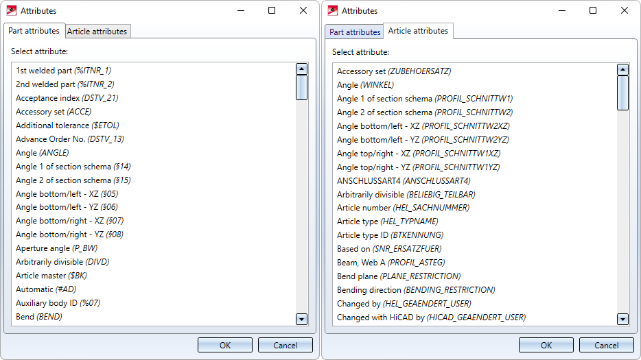 symbol (alternative: double-click). A list of the available attributes will then be displayed for selection. A distinction is made between HiCAD Part attributes and HELiOS Article attributes.