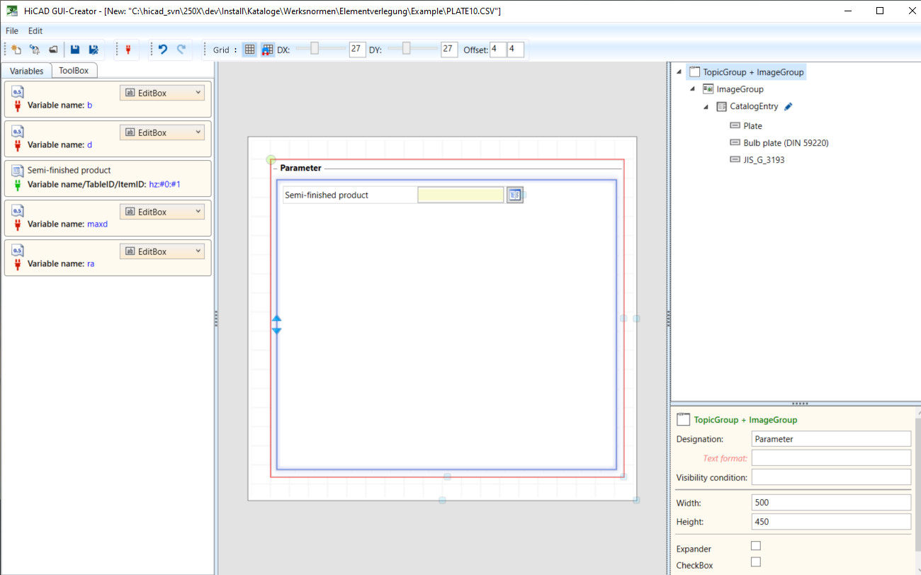 Now the dialogue window can be saved, e.g. with the name plate_dia.isdgui, in the catalogue Werksnormen\Elementverlegung\Example.