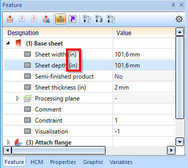 If a part is inserted into a drawing created with a different unit, this will be indicated in the feature ICN by displaying the original unit.