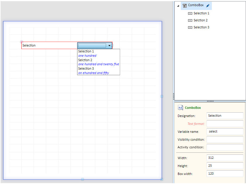 This ToolBox object defines a field with a selection list, from which only one entry can be chosen at a time. Manual entries are not possible here. ComboBox objects can be defined for numerical values (Double) as well as for texts (String).