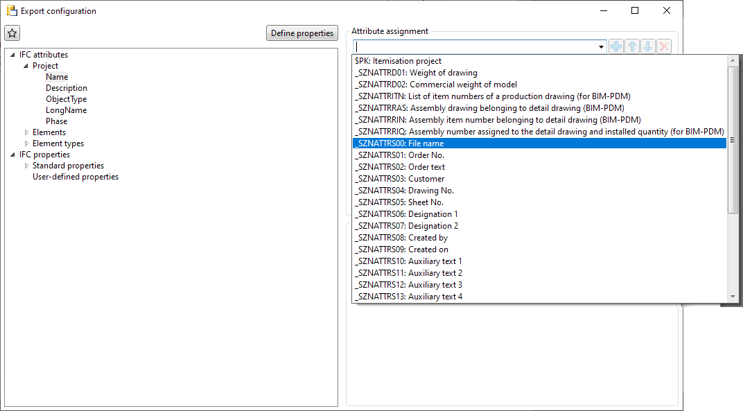 On the left hand side beneath IFC attributes you choose the target element, on the right hand side beneath Attribute assignment you choose the HiCAD data source.