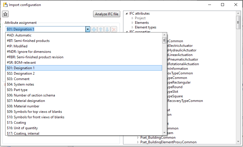 Use the Analyze IFC file button to select an existing IFC file which will then be analyzed. Your individual PropertySet definitions will be additionally loaded into the tree of IFC attributes that can be mapped with appropriate HiCAD attributes on the left hand side.