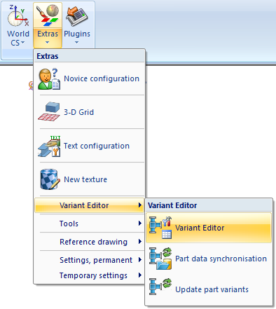 For general Feature Variants, start the Variant Editor via the Drawing Ribbon tab: There, choose Others > Extras