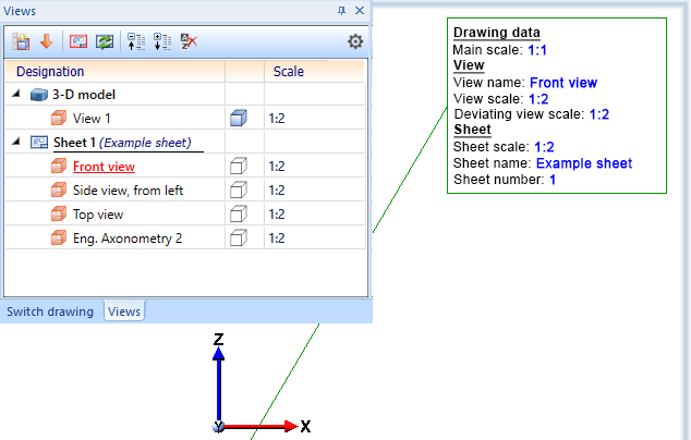Drawing properties, A different view scale only exists if the view scale and main scale are different. The sheet scale only exists if all views on the sheet have the same scale. Not relevant are sectional and detail views, views of sheet metal part developments and axonometries in workshop drawings. The sheet name only exists if a name has been assigned to the sheet.