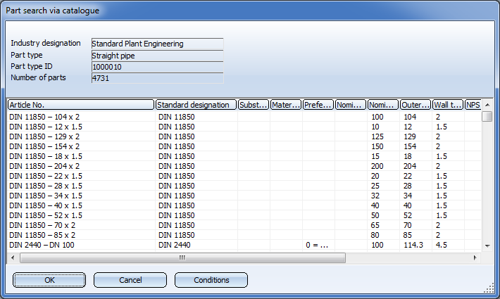 If you have chosen Parts from: Catalogue on the Part selection tab of the Plant Engineering Settings dialogue window, a selection list of the parts which are available according to the given settings and the current fitting situation is displayed.