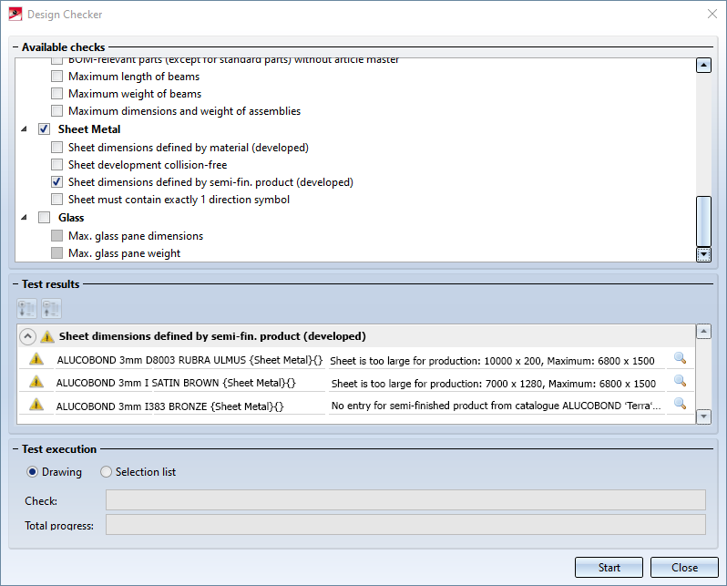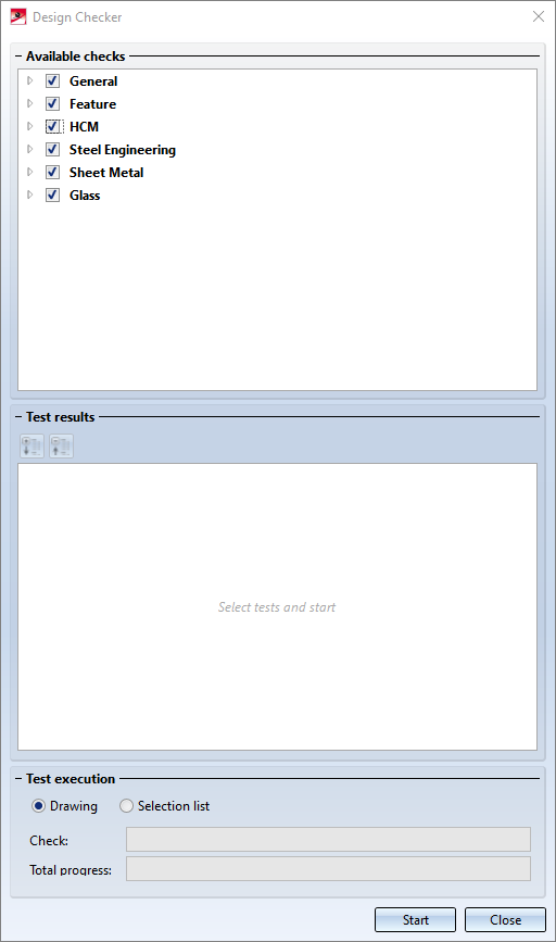 HiCAD checks the active drawing or all assemblies of the selection list. Activate the desired option in the Test execution area. As long as the dialogue window is open, you can freely change the selection list to be checked.