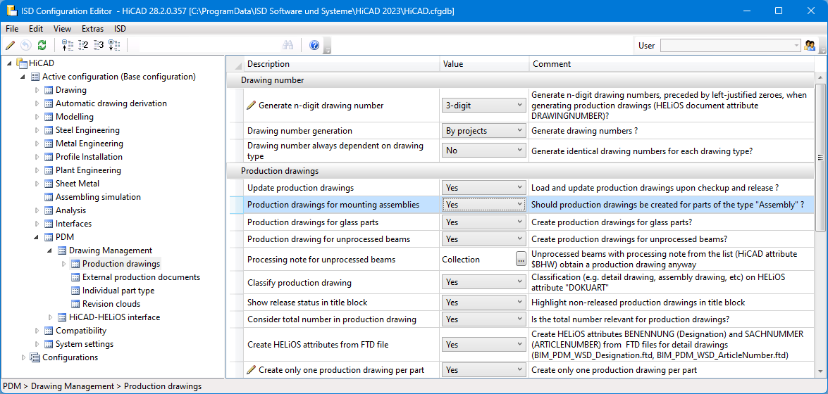 In the Configuration Editor at PDM > Drawing Management > Production drawings the new parameter Production drawings for mounting assemblies is available. With this parameter, mounting assemblies (Type: Bolted assembly) can be excluded from the production drawings if required. The default setting is Yes.