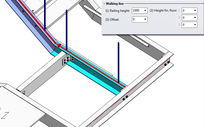 - Call the Railing Configurator again. Select the beams in such a way that the walking line will be displayed as shown below. End the selection by pressing the middle mouse button.