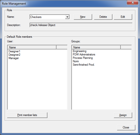 The Print member lists button opens a list of all Users and Groups assigned to the active Role in the HiCAD Report-Manager.