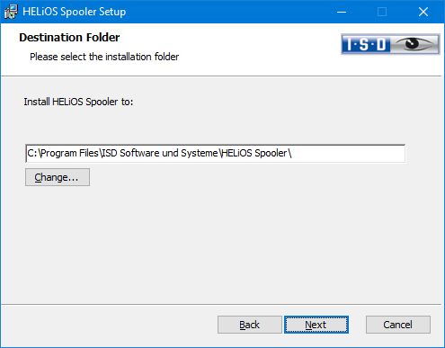 Enter a path for the HELiOS Spooler installation. Suggested will be the default path C:\Program Files\HELIOS Spooler. If you want to select a different path, click Change... and enter the desired directory. Then, click Next.