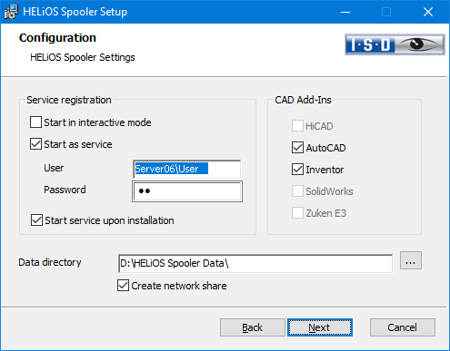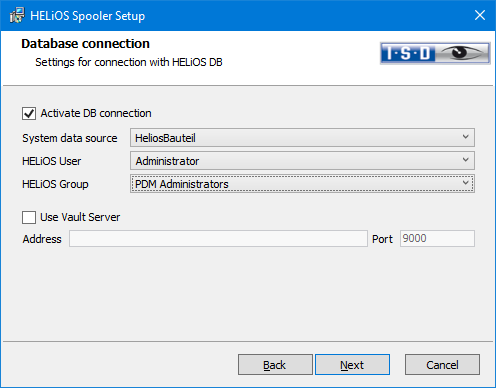 The HELiOS User via which the Spooler will run is also selected here. It is important that this user has administration rights and is also assigned to the HELiOS Group "PDM Administrators" at this point. Otherwise you will receive an error message.