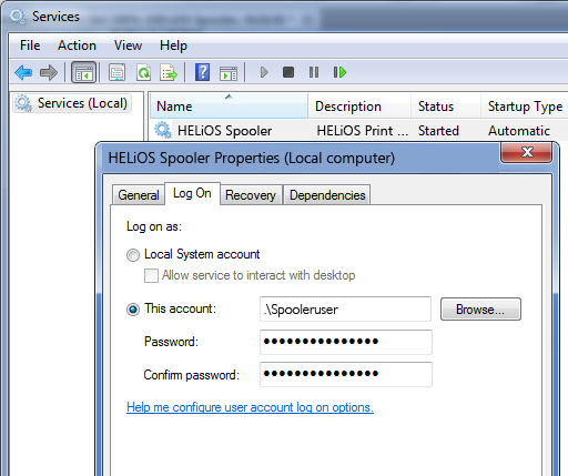 If the password of the HELiOS Spooler should change or expire, click the Start icon on the Windows task bar and select Control Panel > Administrative Tools > Services (or Local Services in other Windows versions). Right-click the HELiOS Spooler service and choose Properties. In the Properties dialogue window, open the Log On tab and enter the new password.
