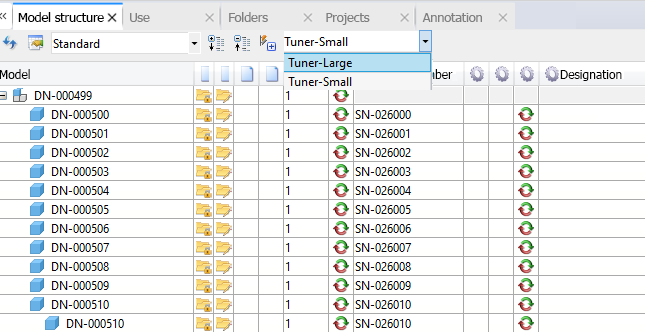 With a double click (or right click and Show document...) on the corresponding iPart/iAssembly document in the structure, you can switch between the different configurations in an additional selection field in the model structure of the corresponding document context