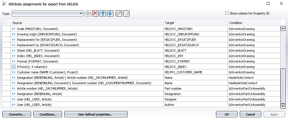 Model property (Properties such as Weight, Volume etc.) If the assignment is linked to a particular Condition that needs to be fulfilled in order that a synchronization of HELiOS attribute and CAD attribute can take place, this condition will be shown in the same-named column.