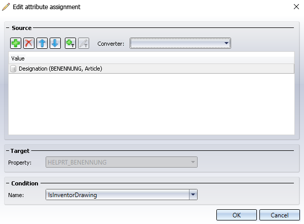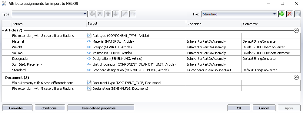 Model property (Properties such as Weight, Volume etc.)If the assignment is linked to a particular Condition that needs to be fulfilled in order that a synchronization of HELiOS attribute and CAD attribute can take place, this condition will be shown in the same-named column.