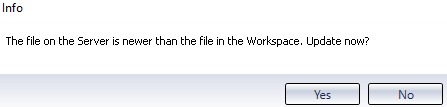 If the local file is newer than the file on the Server, you will be asked whether you want to discard the local changes and load the older Server state into the Workspace. Since this is usually not the case, you should click No and save the local state of the document to HELiOS. Click only Yes if you are sure that you really want to do this.