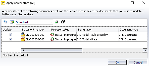 Applies the current Server state to all documents in the loaded document, including all documents that are subordinated to the active document. If the Server state of the corresponding documents is newer than the local state of the document - - e.g. because the document has been saved by a different user in the meantime, or exists with a newer index, or because the master data of a linked article have changed or the article exists with a newer index - a selection dialogue will be displayed where all documents with a newer Server state are listed: