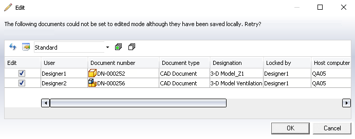 Saves the document and synchronizes the configured properties with the server. The CAD attributes will be synchronized with HELiOS upon saving. In the process, all parts and/or structures, complete with their sub-structure, will be saved. If an assembly cannot be saved completely - e.g. because changed components (referenced documents) are currently being edited by another user - this will be indicated in dialogue windows based on the HELiOS result list principle. There you can see, for instance, which documents are currently being edited (and, therefore, locked) by which user and on which host computer.