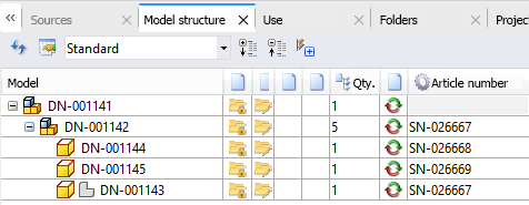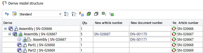 When the substitute object is transferred to the database or the model structure is derived, it automatically receives the same article master as the underlying assembly.
