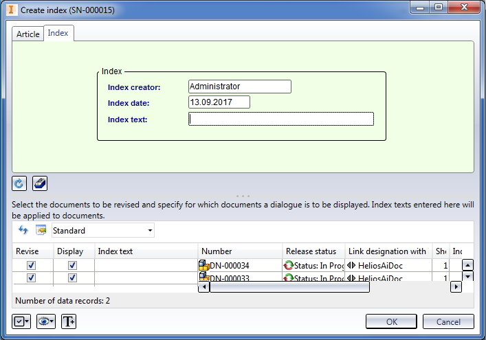 The index change starts from the article. If the article does not exist (in case of a pure "document link") or has not been released, only an index change of the document will be offered.