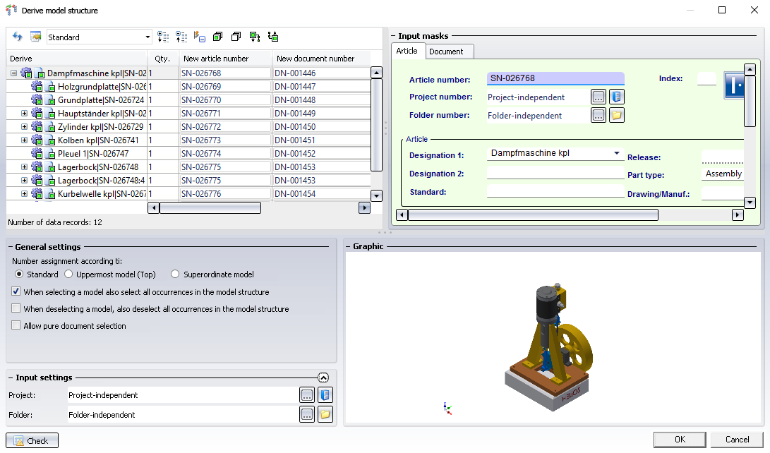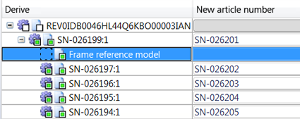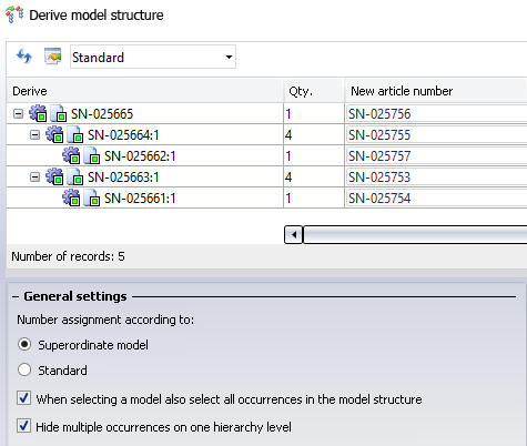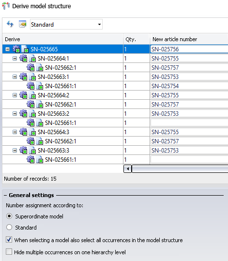 If the When selecting a model also select all occurrences in the model structure checkbox has been activated when you select a specific part or assembly with a mouse-click, each individual occurrence of that part or assembly will also be selected for derivation in the model structure. If the checkbox is deactivated, multiple occurrences can also be derived individually.