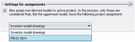 The additional Settings for assignments option will be offered if 1. the main assembly has been assigned to at least one project and has been selected for derivation and 2.) a project is active.