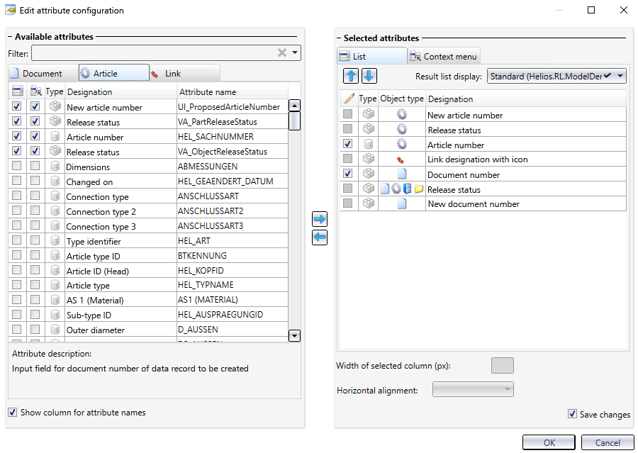 For the tabs Document, Article and Link on the left hand side, the corresponding attributes are listed according to object type. The removing of checkmarks will remove currently displayed attributes from the list, while the activating of checkboxes will add further attributes.