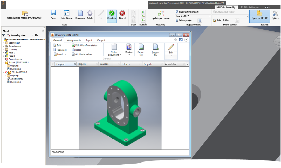 The HELiOS <-> Inventor interface enables you to load and save drawings and documents in Autodesk Inventor via the HELiOS Database, and use Inventor for HELiOS Projects and Folders.