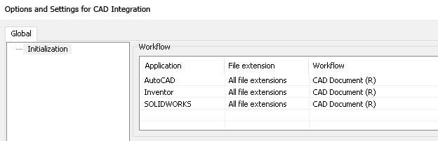 In the global configuration of the CAD integration you can define certain initialisation values.