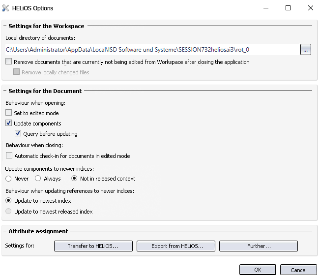 - Update components: If components of a document exist as newer versions, these will be updated to the newer states if this checkbox has been activated. This concerns both (file) changes of the corresponding components and the indexing by HELiOS, and takes effect upon opening and choosing Data > Apply server state. The updating takes place from top to bottom, i.e. sub-components with a newer server state will also be updated (in some cases after an explicit security prompt - see below) when the superordinate document has been replaced by a newer server state.