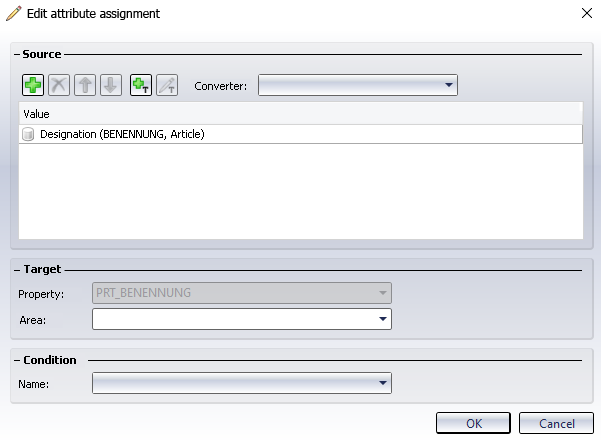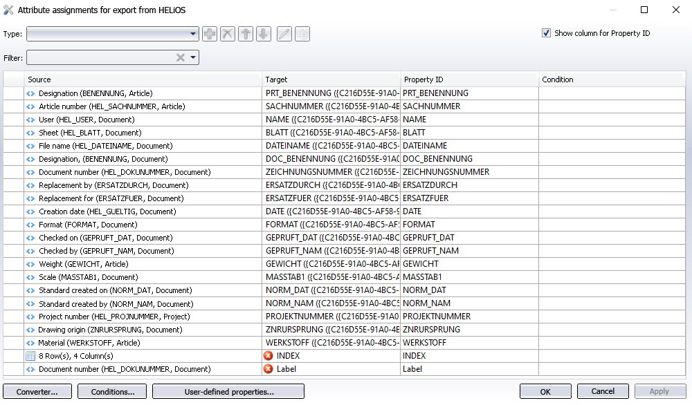 If the assignment is linked to a particular Condition, which must be met to make the HELiOS attribute->CAD attribute mapping possible, this condition will be shown in the corresponding column.